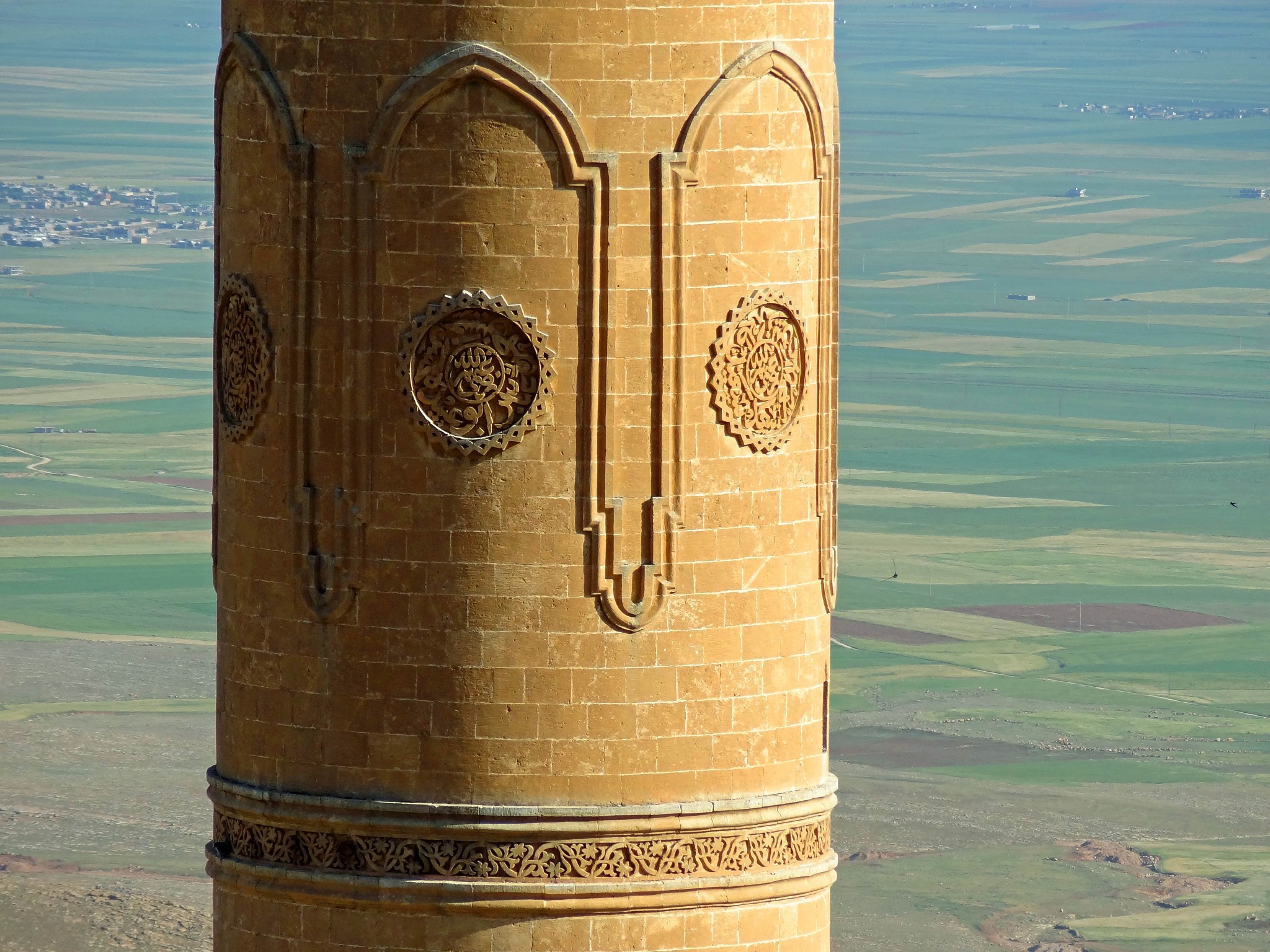 Detail of a minaret with landscapes of Upper Mesopotamia in the background.